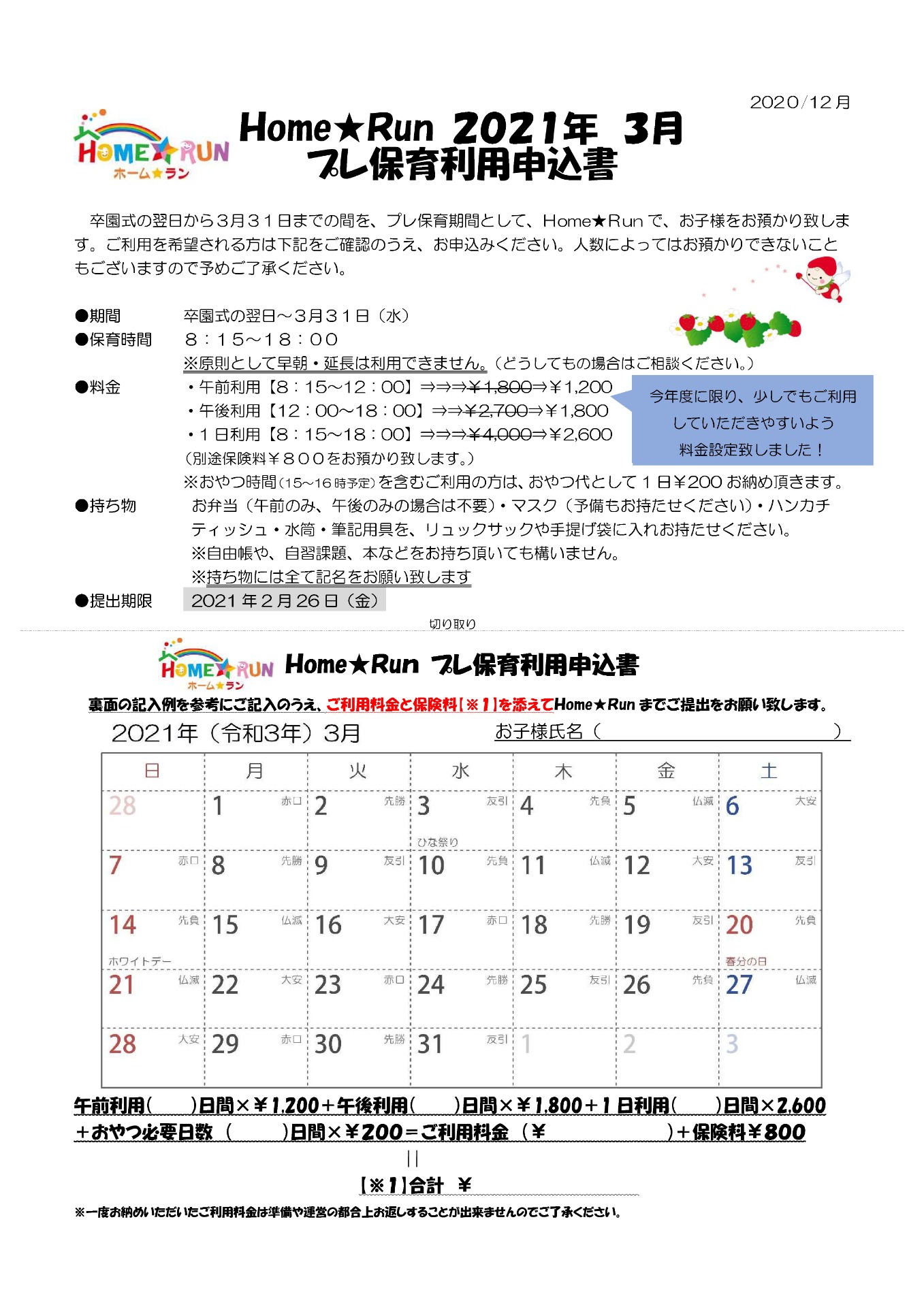 放課後児童クラブ Home★Runでは、3月にプレ保育期間を設けています。